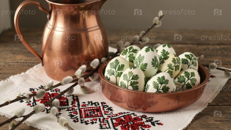 Праздничные пасхальные яйца в медной миске с ветвями ивы