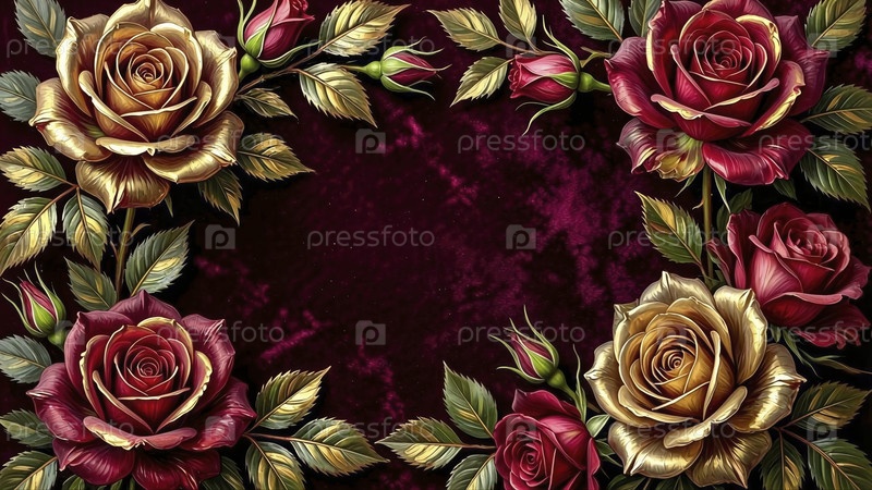 Золотые розы и красный бархатный фон