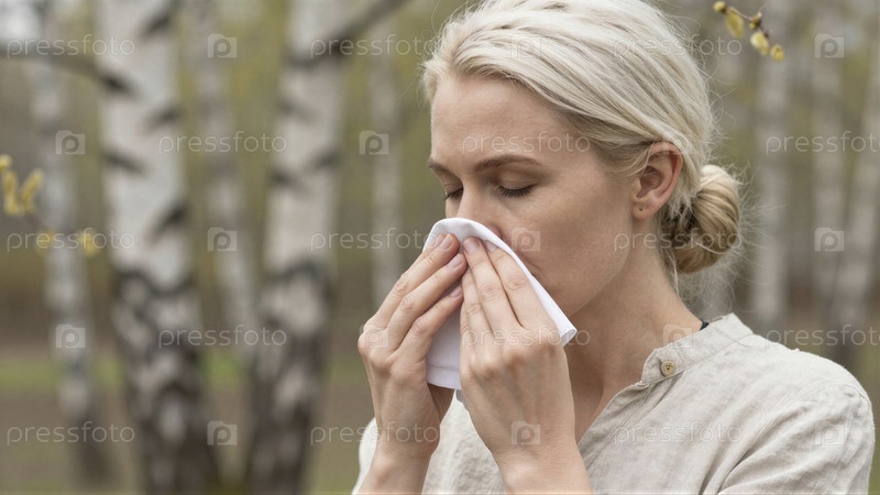 Женщина, дующая нос на открытом воздухе во время сезона пыльцы
