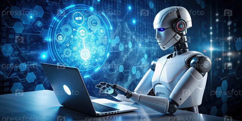 Робот, использующий ноутбук для разработки задач. генеративный ИИ AI