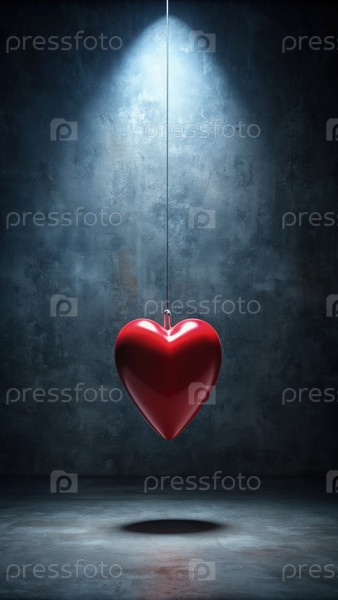 Одно красное сердце, висящее в темной комнате
