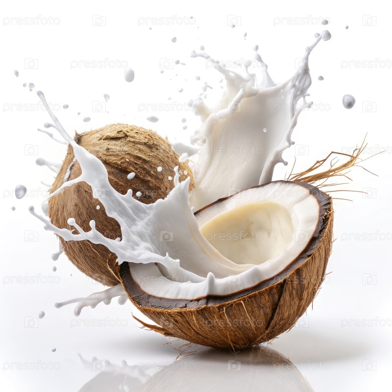 Кокосовое молоко брызгает из сломанной кокосовой скорлупы