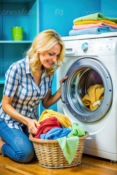 Блондинка загружает белье в корзину после цикла стиральной машины
