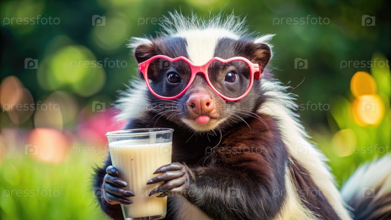 Скунк наслаждается молочным коктейлем в солнцезащитных очках в форме сердца в солнечный день