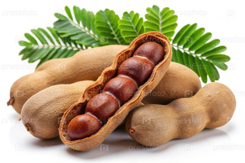 Близость свежего фрукта тамиринда с листьями на белом фоне