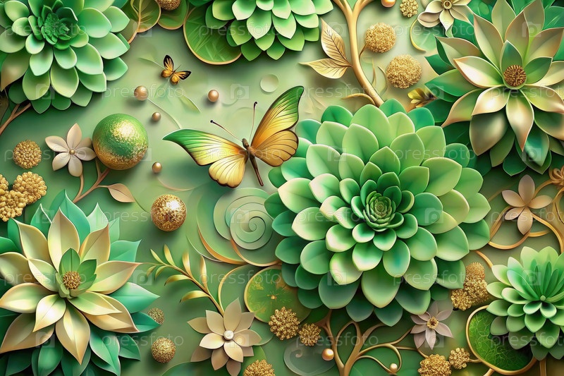 Abstract Цветочный обой с зелеными сокулентами и золотыми бабочками