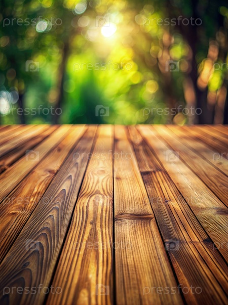 Деревянная палуба с солнечным светом, сияющим через лесной навес