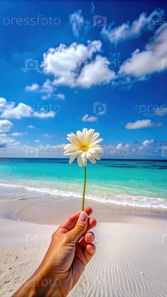 Одинокий белый цветок, удерживаемый против тропического пляжного пейзажа