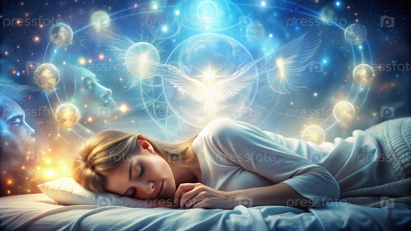 Женщина, спокойно спящая в мягко освещенной комнате с небесными мечтами