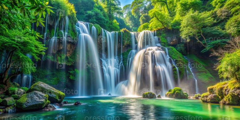 Густозеленые лесные водопады каскадов в солнечный день. генеративный AI