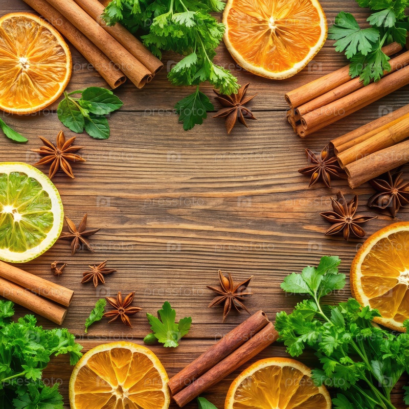 Ароматические специи и цитрусовые фрукты расположены на деревянной столовой поверхности