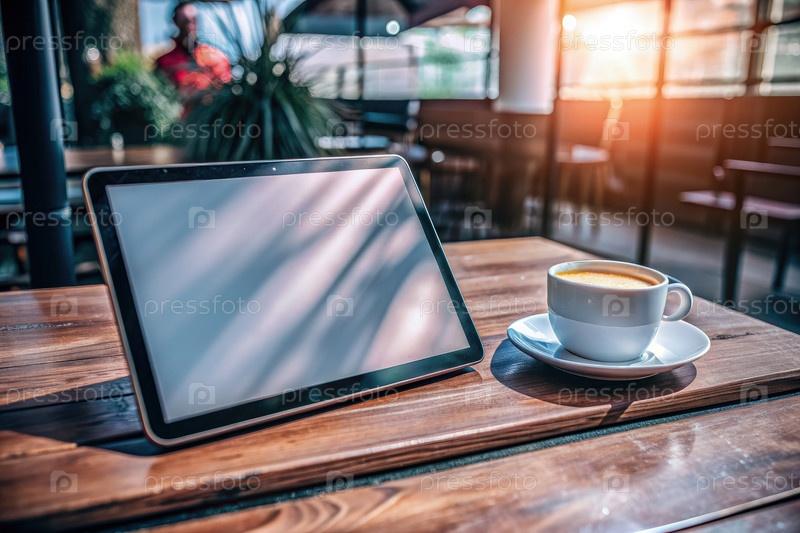 Пустой планшетный экран на деревянном столе с кофейной чашкой в открытом кафе