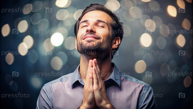 Человек молится с искренней радостью на фоне размытого света