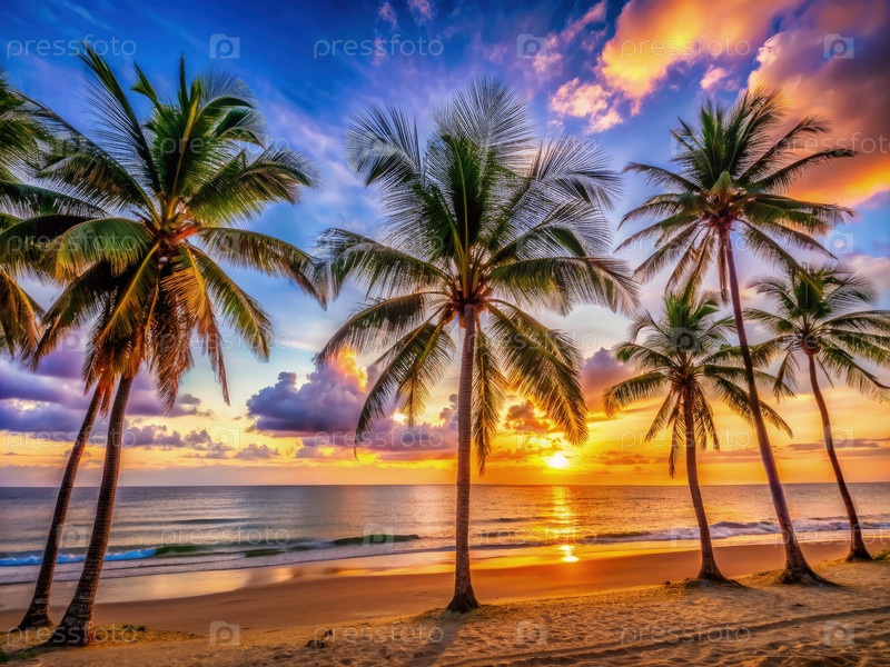 Пальмовые деревья, оформившие силуэт против яркого захода солнца на пляже