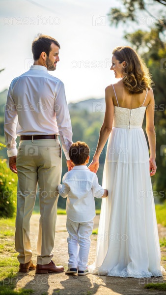 Отец и сын держатся за руки во время церемонии свадьбы на открытом воздухе