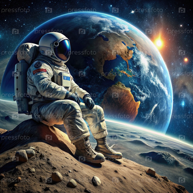 Футуристический астронавт созерцает Землю с лунного форпоста