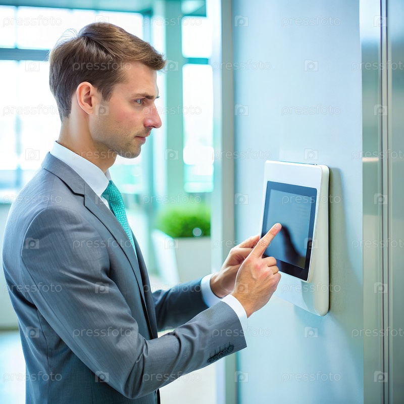 Бизнесмен использует панель сенсорного экрана в современном офисном здании