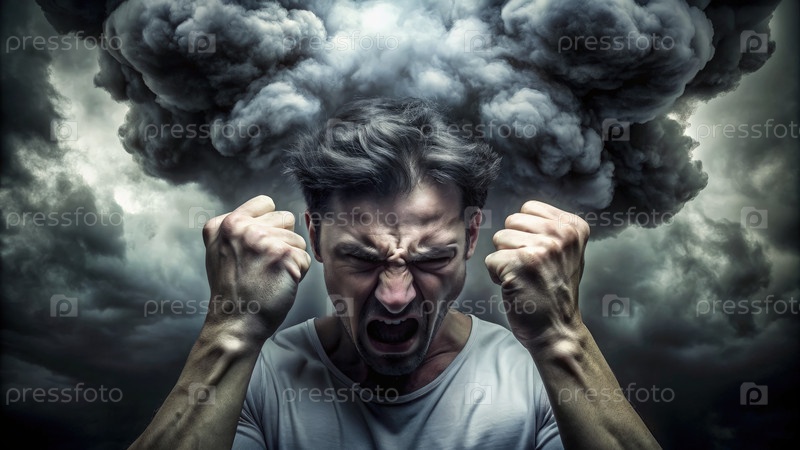 Гневный человек с зажатыми кулаками и облаком дыма над головой