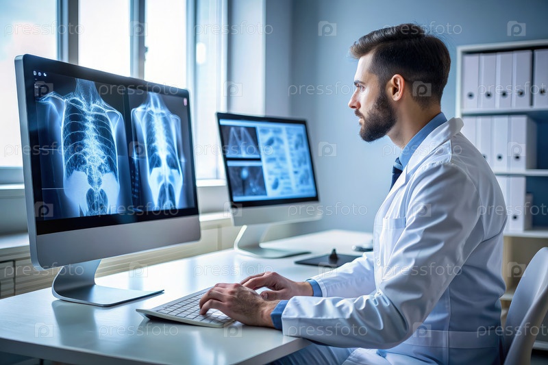 Рентгеновский техник просматривает цифровые изображения грудной клетки в современной клинике