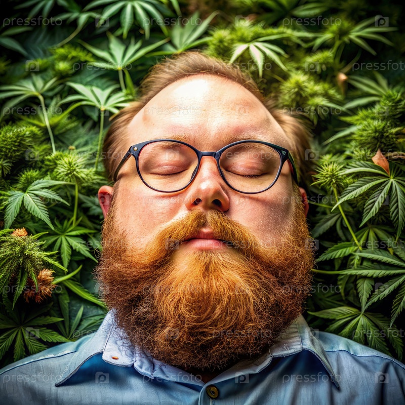 Расслабленный мужчина с красной бородой спит в окружении зеленых растений