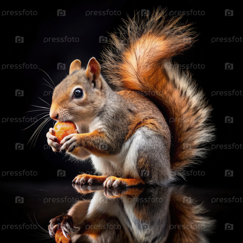 Белка наслаждается орехом на черном фоне