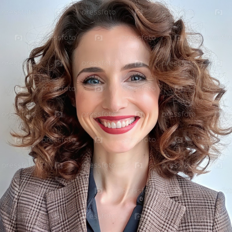 Улыбающаяся женщина с светло-коричневыми кудрявыми волосами, одетая в пладовый блейзер