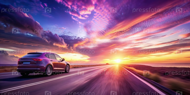 Автомобиль едет к горизонту во время ярко-фиолетового заката
