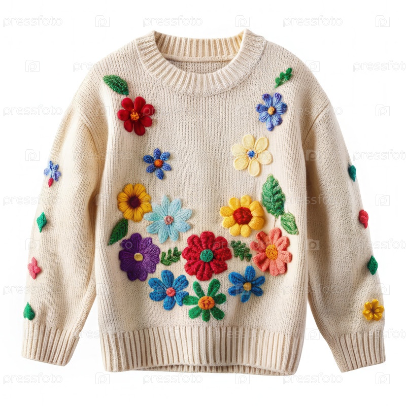Белый трикотажный свитер с красочными цветами аппликация. генеративная AI