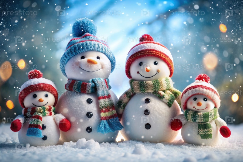 Счастливая семья снеговиков наслаждается снеговым Рождественским вечером