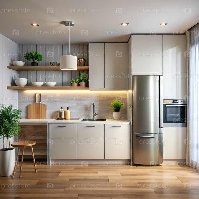 Минималистская кухня с холодильником из нержавеющей стали и деревянными акцентами