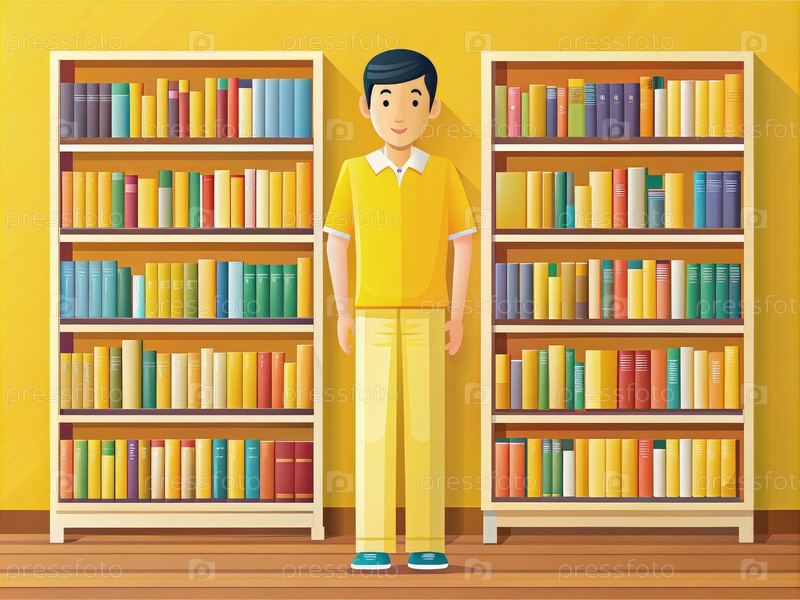 Мультфильм Человек, стоящий рядом с полными книжными полками в желтой комнате