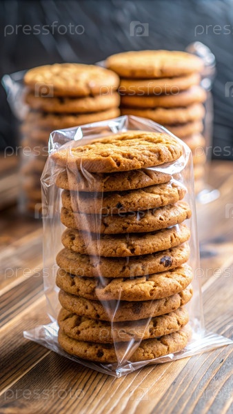 Закрытие свежевыпеченных печенье в пластиковом мешке на деревянном столе