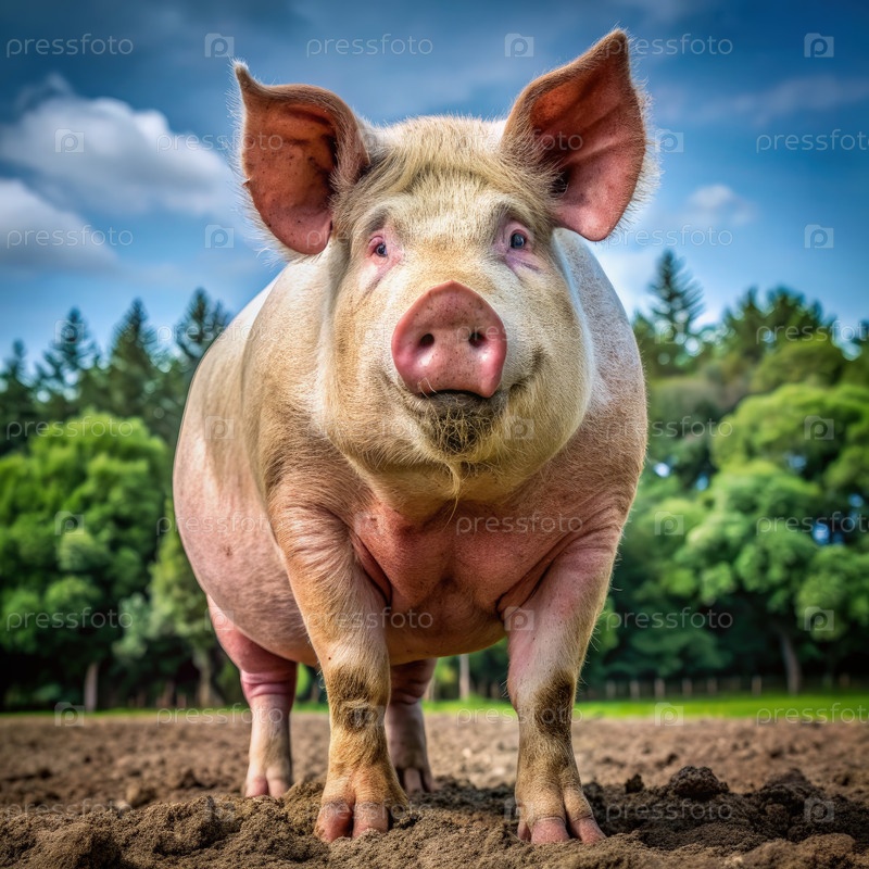 Розовая свинья стоит на поле в солнечный день