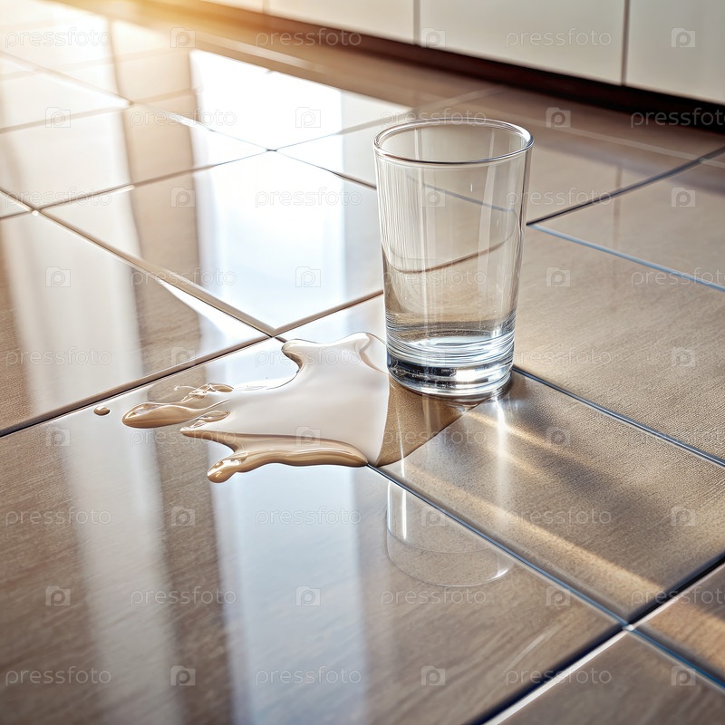 Пролитая вода на светлый плиточный пол в кухне. генеративный ИИ