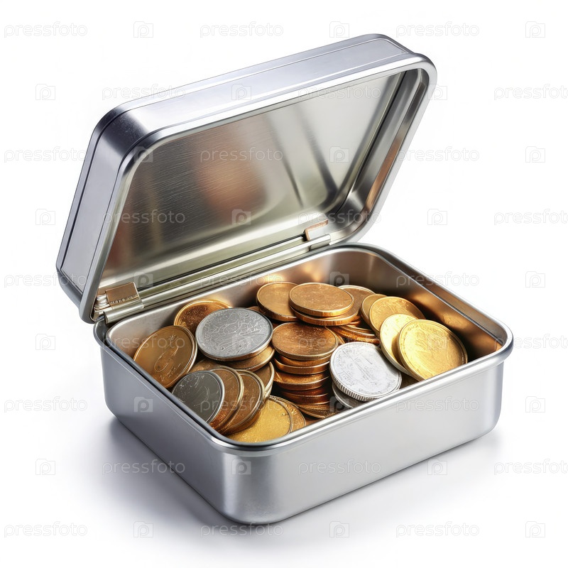 Алюминиевая коробка, заполненная монетами на белом фоне