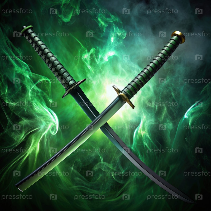 Две длинные зеленые и черные изогнутые киберкатаны пересекаются на фоне зеленого дыма