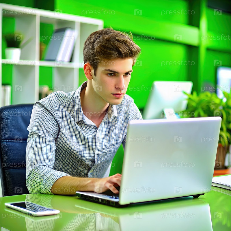 Молодой человек, ищущий работу онлайн в современном офисе