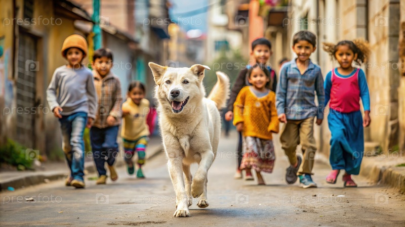 Белая собака Алабай бегает по улице на глазах у детей