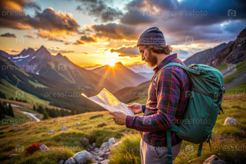 Рыбак, изучающий карту на закате в горной долине
