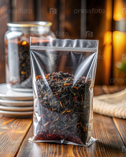 Черный чай в прозрачной вакуумной упаковке на деревянном столе