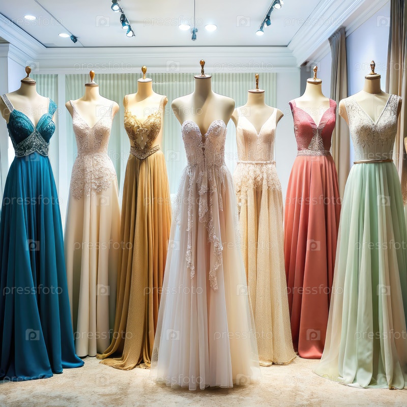 Элегантные вечерние платья изображены на манекенах в розничном магазине