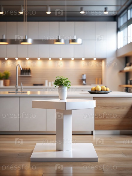 Белый круглый подиум для отображения продуктов на современной кухне. генеративный ИИ