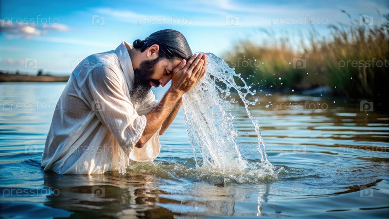 Человек, очищающий себя водой в спокойном озере под голубым небом