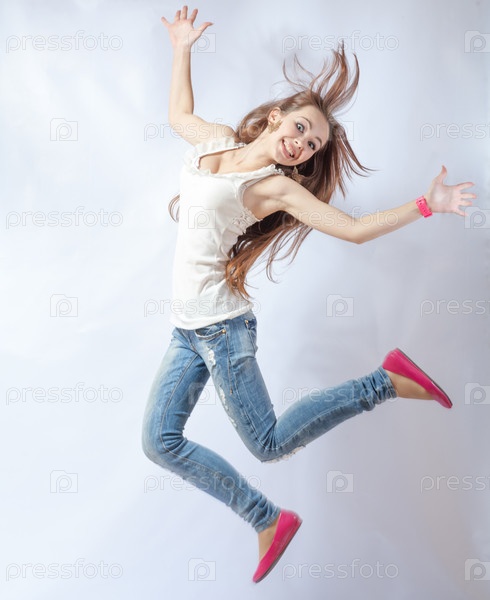 Молодая женщина танцует на белом фоне