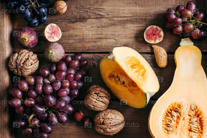 Натюрморт с тыквой, виноградом, инжиром и орехами