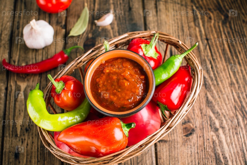 Миска с острым соусом (аджика или сальса), окруженная свежими перцами чили и болгарским перцем в корзине