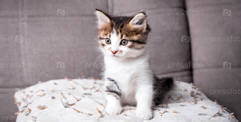 Котенок имеет трехцветный окрас (белый, коричневый, черный) с табби-полосками на голове и хвосте