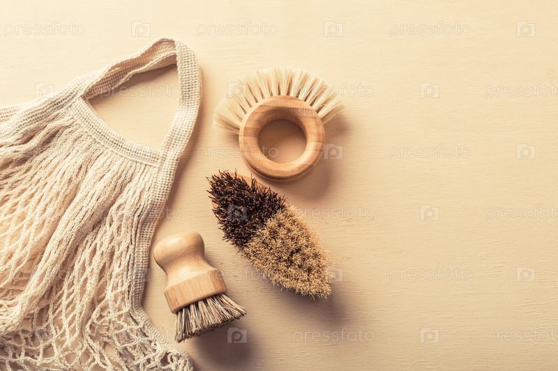 Экологичные кухонные принадлежности, включающие бамбуковые щетки для мытья посуды и сизалевую щетку для уборки