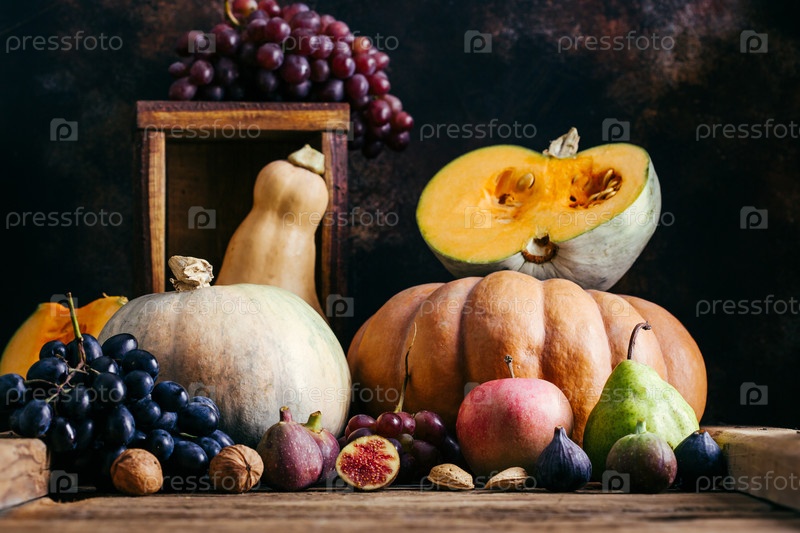 Натюрморт с тыквой , инжиром, виноградом, орехами