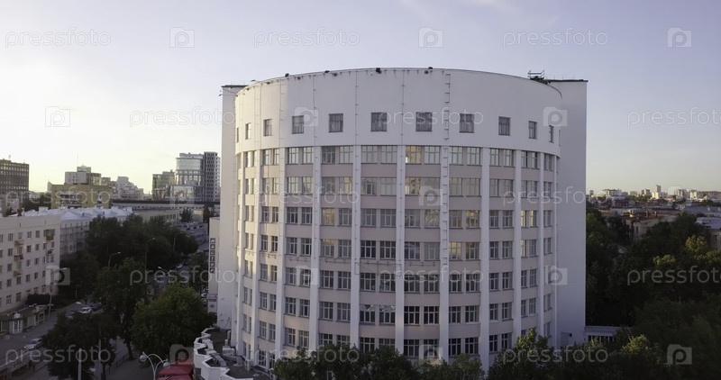 Вид с воздуха показывает современное здание в оживленном городе на закате солнца, подчеркивая его уникальные дизайнерские особенности